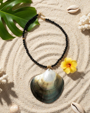 Elevate your tropical style with this handcrafted Islakoko necklace, featuring smooth Natural Black Agate Onyx beads enriched with some gold spacer beads. At its centre lies a captivating Black Mother of Pearl shell, glowing with the shifting colours of deep tropical waters. The dark, glossy onyx pairs beautifully with the shell’s ocean-born iridescence, creating a look that’s both island-inspired and effortlessly elegant. Finished with a polished gold clasp and Islakoko gold tag, this piece brings a touch of luxe paradise to any outfit—perfect for those who love sophisticated tropical vibes with a bold edge.
