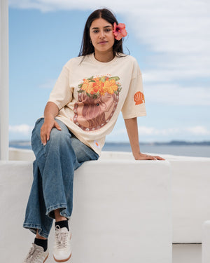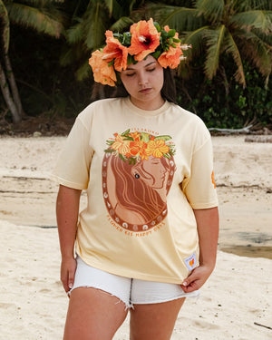 Our ‘Flower Eis Happy Days’ Tee is a beautiful graphic tee representing the flower crowns (eis, leis) of the Pacific, a beautiful adornment for any occasion. This vibrant t-shirt design captures the essence of the island girl's life and the happiness of making and adorning a beautiful fresh handmade Ei Katu. Our t-shirts are oversized so nice and loose for that stylish look and are made from quality 100% breathable cotton. This print is unique and designed by us.