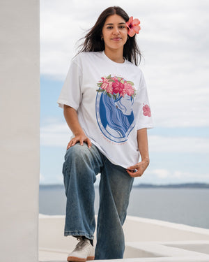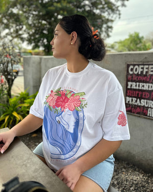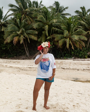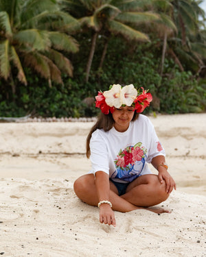 Our ‘Flower Eis Happy Days’ Tee is a beautiful graphic tee representing the flower crowns (eis, leis) of the Pacific, a beautiful adornment for any occasion. This vibrant t-shirt design captures the essence of the island girl's life and the happiness of making and adorning a beautiful fresh handmade Ei Katu. Our t-shirts are oversized so nice and loose for that stylish look and are made from quality 100% breathable cotton. This print is unique and designed by us.